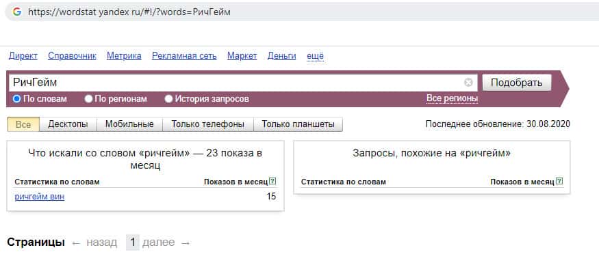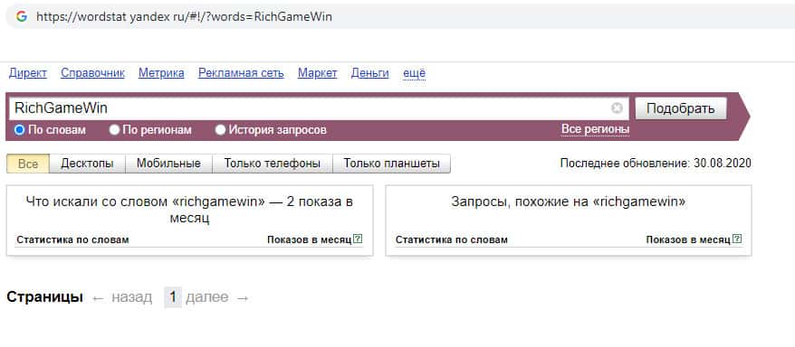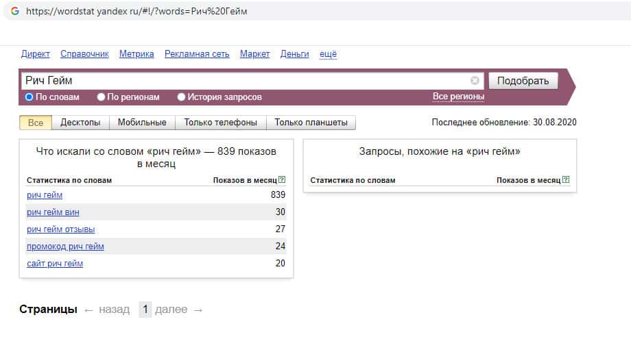 Решили мы проверить и количество запросов фирмы RichGame Win по русскоязычному названию конторы, а именно "Рич Гейм". 839 раз пользователи выполнили этот запрос.