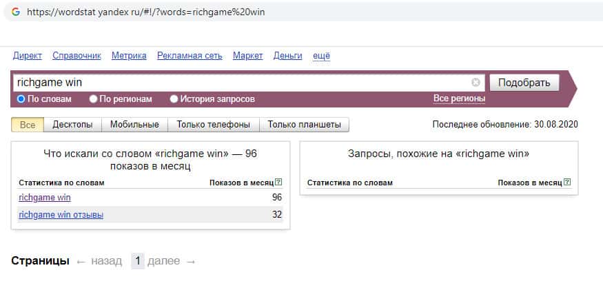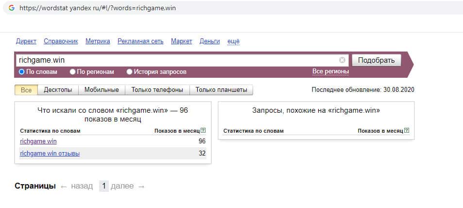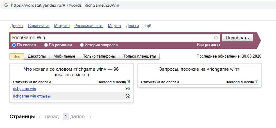 Мы проверили количество запросов компании Рич Гейм по названию фирмы, а именно "RichGame Win". Оказалось, что всего 96 раз пользователи выполняли данный запрос.