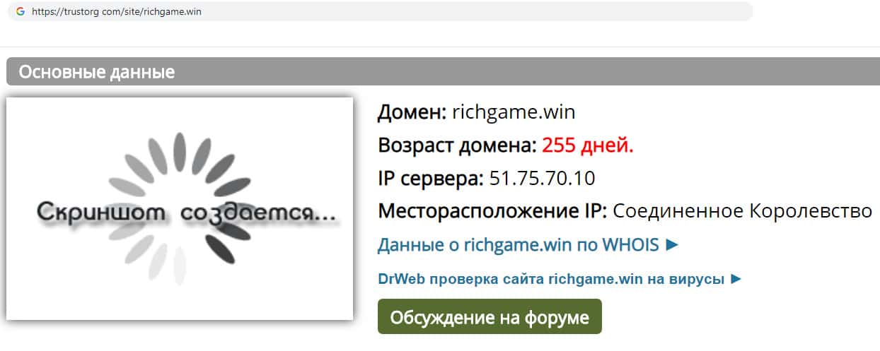 Через интернет ресурс "Доверие в Сети" мы проверили возраст компании жуликов RichGame Win. Оказалось, что фирме нет и года, что является явным признаком лохотрона.
