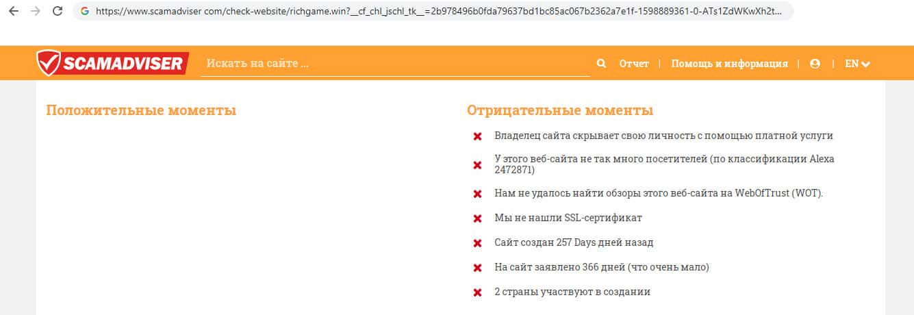 - Мнение сайта scamadviser com о конторе мошенников RichGame Win