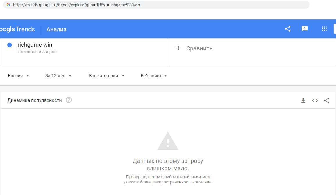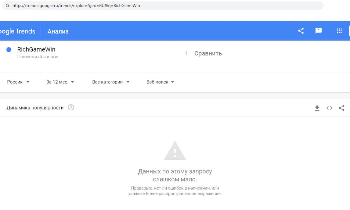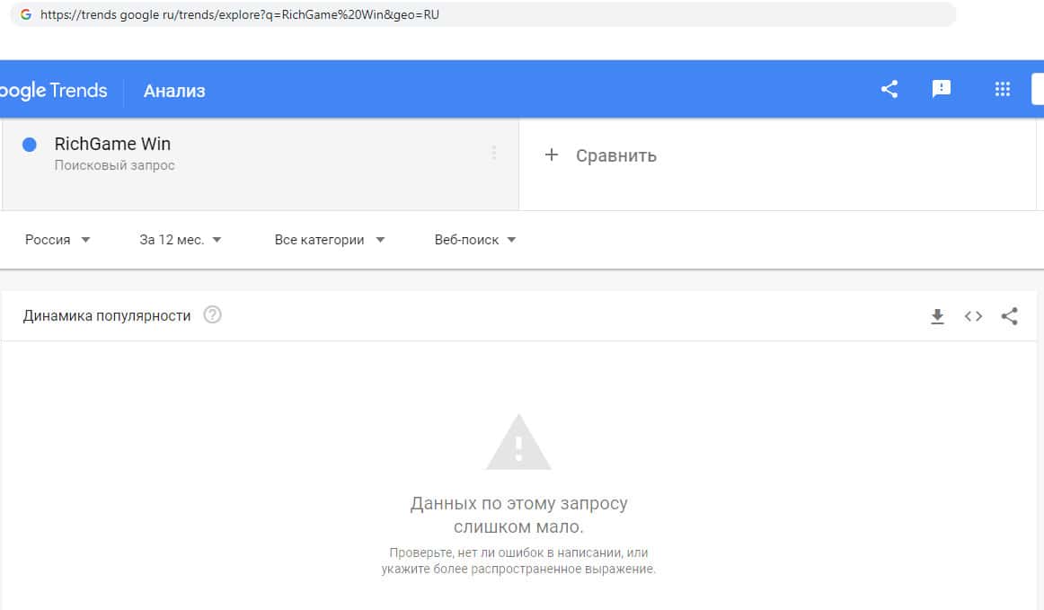Мы проверили количество запросов лохотронщиков RichGame Win в Google по названию компании, а именно "RichGame Win", но данный запрос пользователи не выполняли.