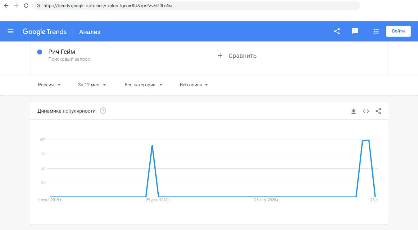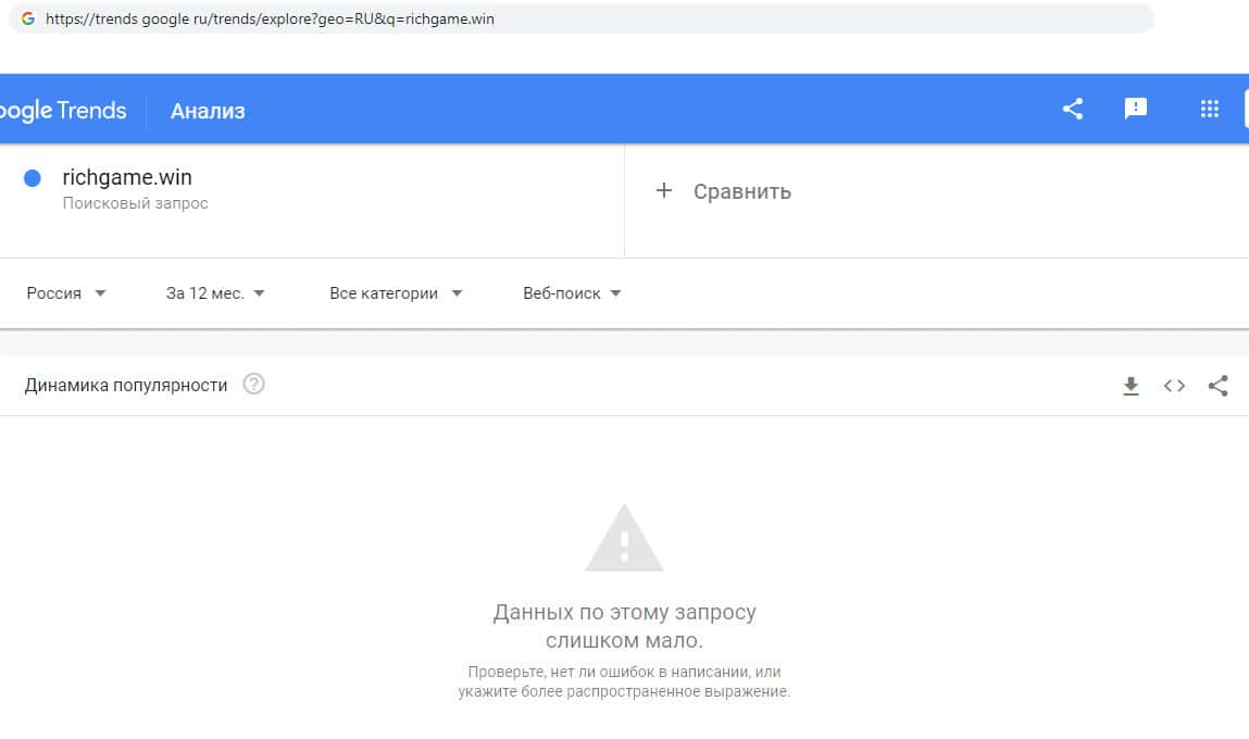Далее мы проверили количество запросов лохотрона Рич Гейм по домену компании без точки, а именно "richgame win". Оказалось, что в течении года никто не выполнял данный запрос.