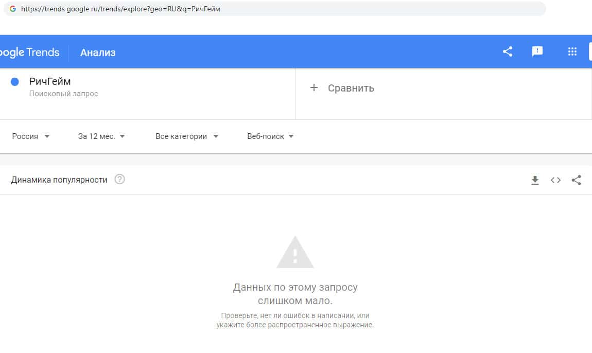 Ещё мы проверили количество запросов фирмы жуликов Рич Гейм по русскоязычному названию, но без пробела, а именно "РичГейм". Но данный запрос никто не выполнял в течении года.