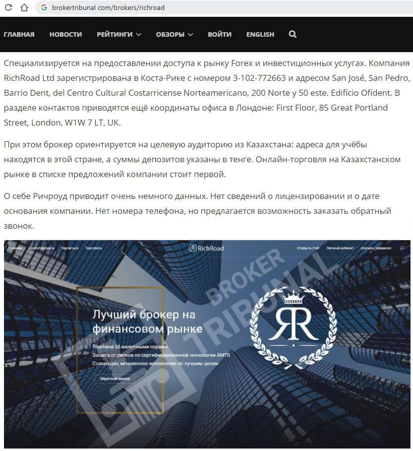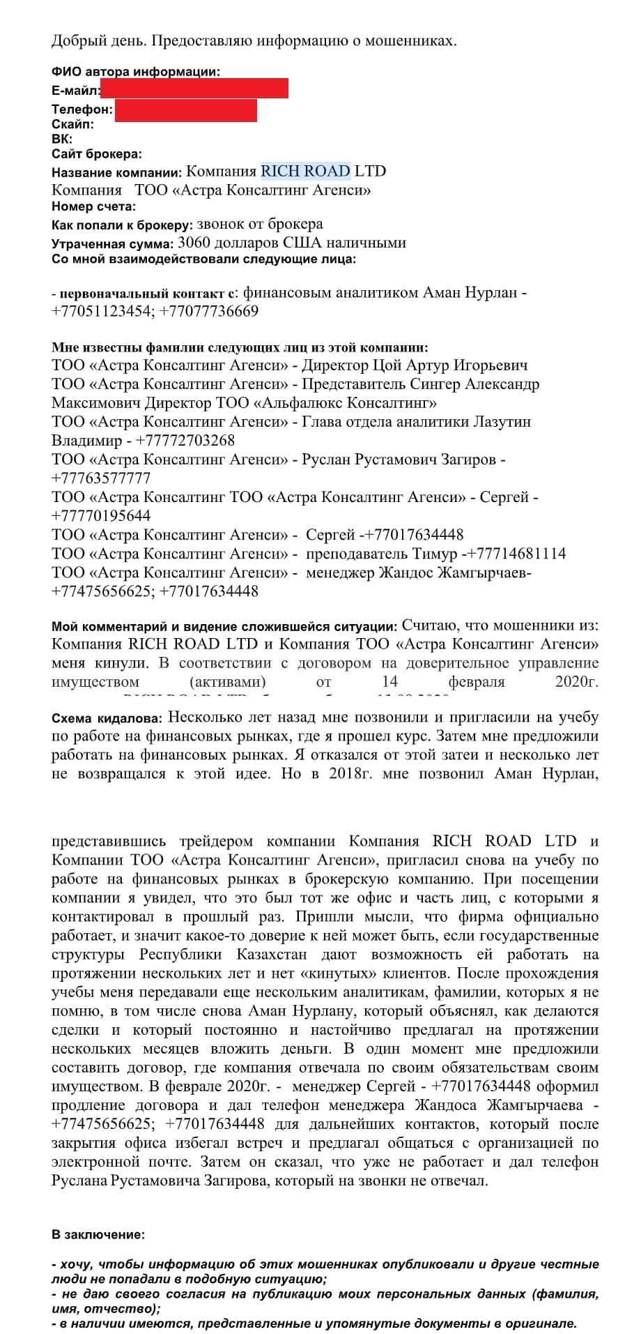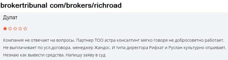 Рич Роад - еще одна кухня, которая выдает себя за брокерскую компанию. На самом деле, это просто мошенническая контора, нагло разводящая своих доверчивых клиентов на деньги. Кроме того, эта мошенническая контора связана с еще одной компанией, такими же жуликами AstraConsulting Kz, которые тоже разводят людей на деньги нещадно. В любом случае вам стоит от них держаться как можно дальше!!!