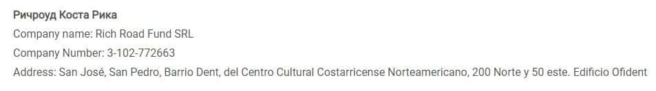 Первый способ, по которому вы можете связаться с мошенниками Рич Роад - это их адрес в Коста Рике, который они указывают у себя на сайте: