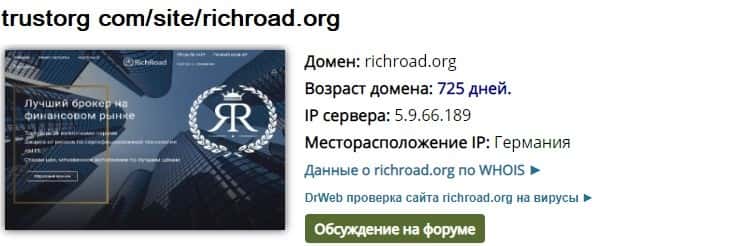 Официально домен мошенников richroad org существует 725 дней. Это внушительный срок для того, чтобы обмануть большое количество людей.