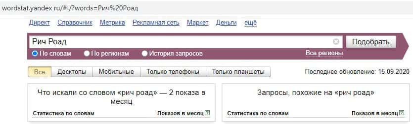 И последний запрос на русском языке в яндексе без пробела "РичРоад" выдает 0 показов в месяц, как и во всех предыдущих случаях.