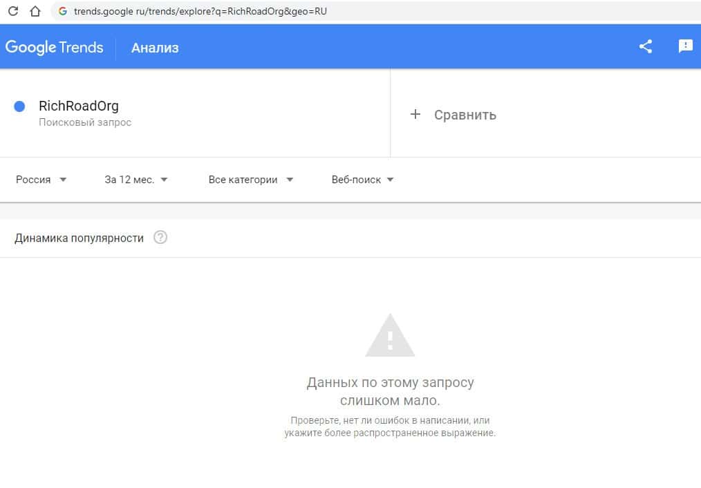 Третий запрос в Google на английском языке без пробелов "RichRoadOrg" выдает результат в 0 показов в месяц. Так информацию о жуликах тоже никто не ищет.
