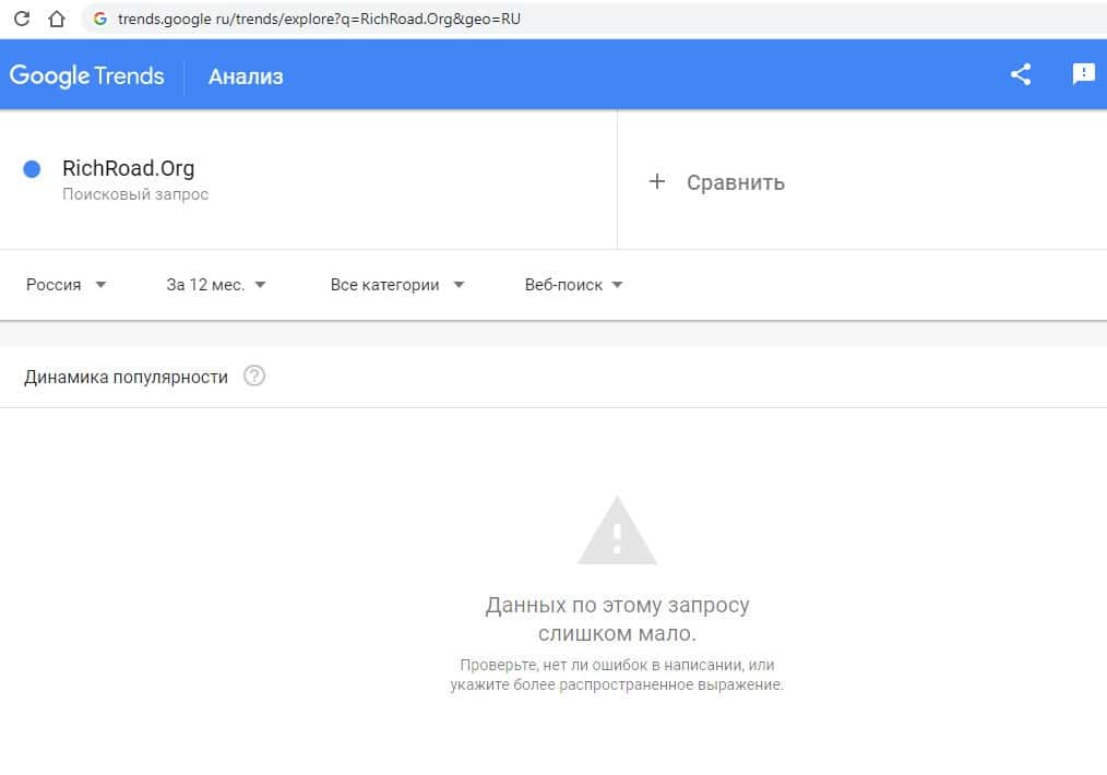 Такой же запрос в Гугл на английском языке только с точкой "RichRoad.Org" выдает точно такой же результат в 0 показов в месяц, как и в предыдущих случаях.