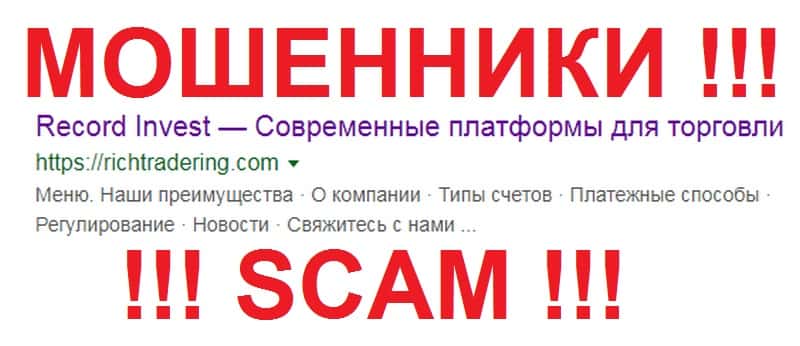Шуллера RichTradeRing могут рассказывать все что угодно, чтобы привлечь как можно большее количество наивных людей в свою организацию. Торговлю на сайте Record Invest невозможно назвать безопасной ,потому что информацию, которую они преподносят пользователю, очень часто встречается на подобных мошеннических сайтах.