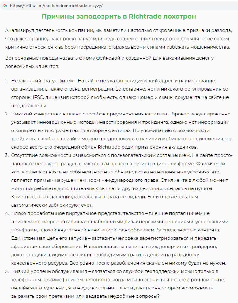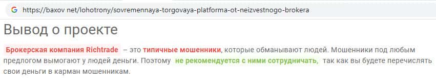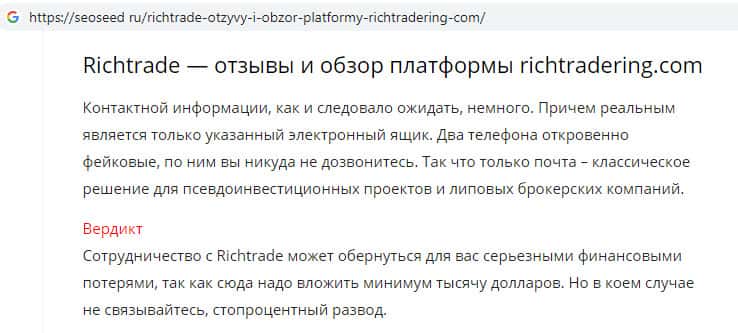 На информационном сайте seoseed ru была замечена статья-отзыв о шараге Рич Трейд Ринг, которая выдает себя за лидера в сфере брокерских услуг, но на самом деле таким не является, потому что в глобальной сети интернет достаточно пользовательских отзывов, которые написаны людьми, которые связались с брокером RichTradeRing и остались в итоге ни с чем.