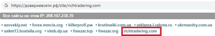 На веб-площадке довериевсети рф была обнаружена информация о том, что сайт мошеннической организации RichTradeRing находится на одном ip-адресе с рекламными сайтами. Следовательно доверять конторе Record Invest нельзя, потому что данная компания фальшивая и не вызывает доверия.
