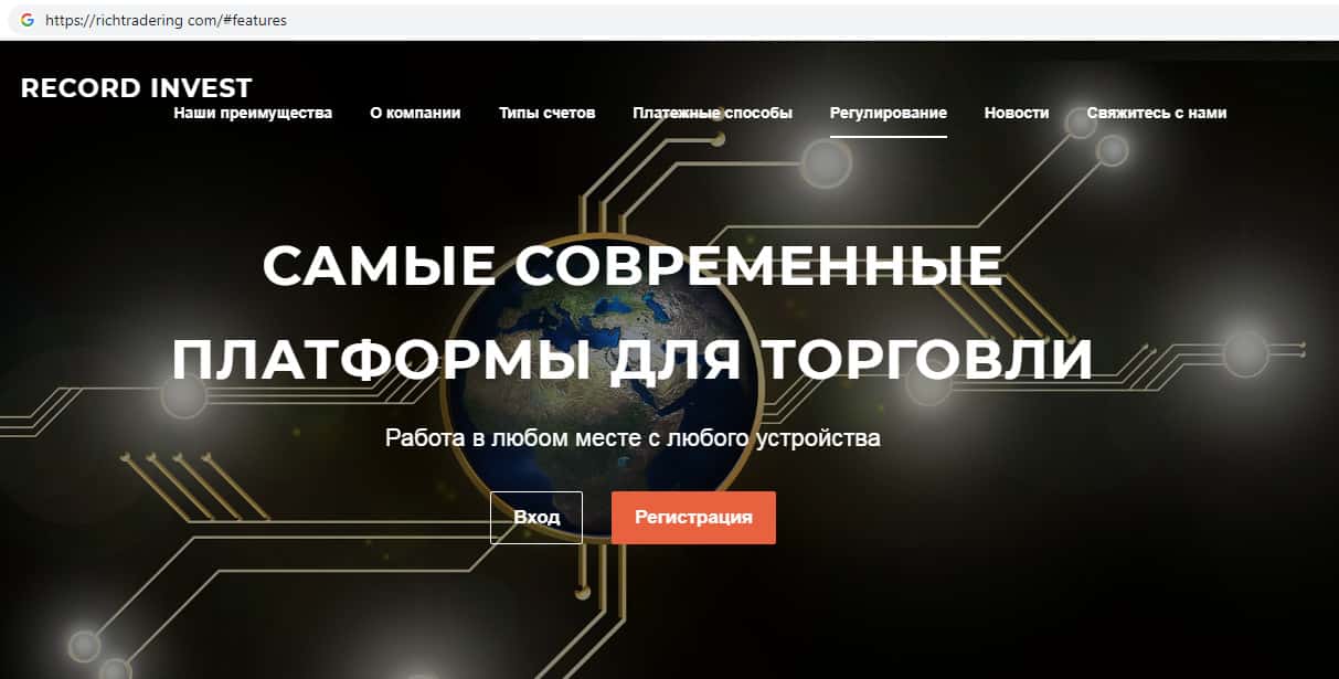 Официальный сайт конторы Рекорд Инвест стандартный и ничем не отличается от сайтов других подобных мошеннических компаний, кроме того, что раньше данная шарага называлась RichTradeRing. После того, как жулики заметили, что о них пишут негатив в интернете, они решили себя переименовать в Record Invest.