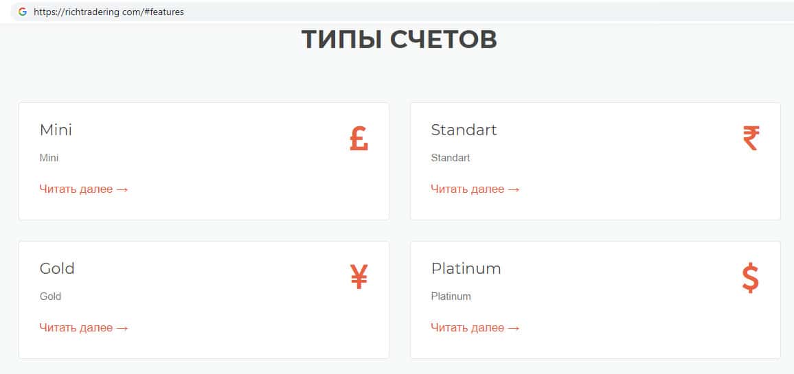 Типы торговых счетов предоставленных на сайте скам-брокера RichTradeRing