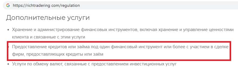 Скам-брокер Рекорд Инвест в виде дополнительных услуг предоставляет возможность взять кредит у их конторы в том случае если у клиента не хватает денежных средств. Велика вероятность того, что никакой прибыли Вы не получите, а можете остаться в долгу перед мошенниками RichTradeRing !!!