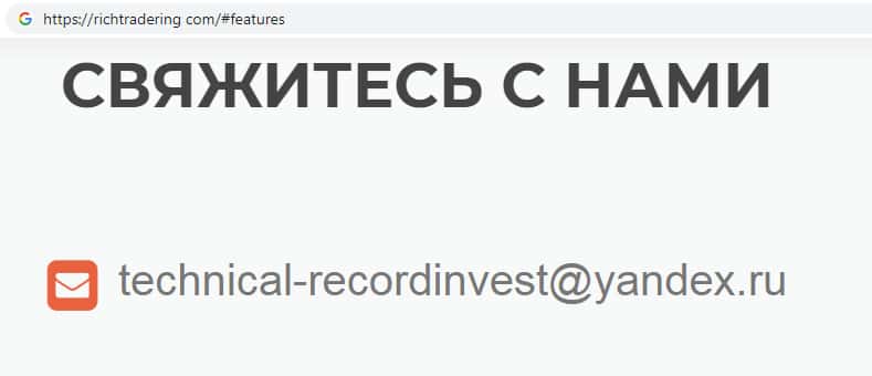 После того, как пользователь заполнил бланк, шуллера Рекорд Инвест просто так не отвяжутся. Не рекомендуем оставлять какие-либо данные о себе на сайте фальшивого брокера RichTradeRing даже в виде адреса электронной почты, поскольку жулики могут манипулировать человеком и воздействовать на принятие решения пользователя торговать на данном сайте.