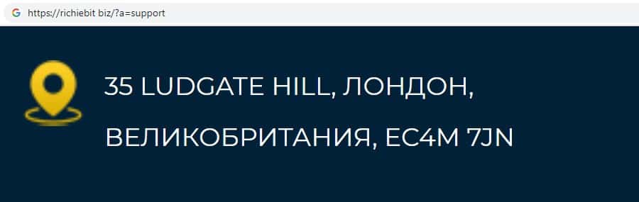 Сведения о месте регистрации Ричие Бит фальшивы, так как большинство мошеннических проектов у себя на сайте указывают адрес в Лондоне для приманки очередного лоха.