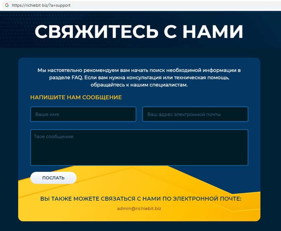 Жулики Ричие Бит на своем официальном онлайн-портале указывают адрес электронной почты, а именно: