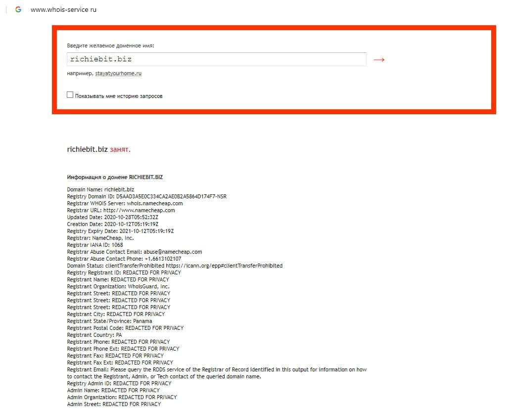 Проведя анализ данных по сайту аферистов Richie Bit, не было обнаружено информации о владельце домена, что является еще одним признаком того, что имеем дело с лохотроном.