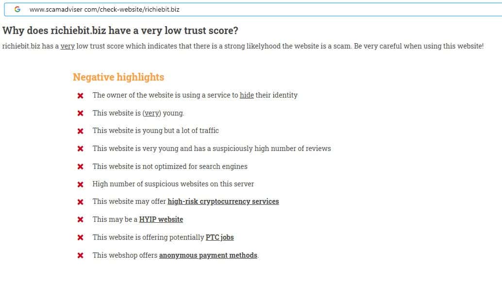Уровень доверия к сайту жульнической конторы Ричие Бит низкий