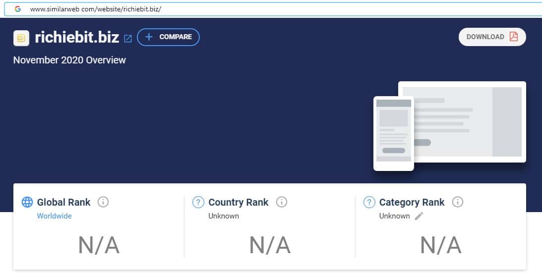 При проверке источников бренда по странам компании Ричие Бит на сайте similarweb com, информация отсутствует, что является признаком фейкового лохотрона.