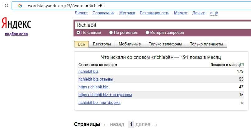 Количество запросов по бренду англоязычного названия компании "RichieBit" на wordstat yandex ru составляет 191 показ за месяц.