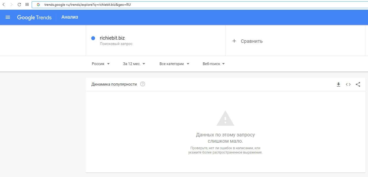 О количестве брендовых запросов название домена компании "richiebit.biz" на Гугл Трендс данные отсутствуют.