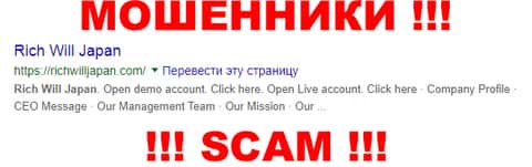 Ричвилл Джапан - очередные мошенники сети интернет, которые в течении пары лет занимаются наглым разводом наивных пользователей сети интернет под предлогом торговли форекс и CFD в ходе которой аферисты Richwill Japan оперативно кидают наивных клиентов на деньги. В связи с этим сотрудничать с лохотроном Ричвилл Джапан не рекомендуем !!!