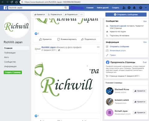 Дабы соответствовать современным трендам мошенники Ричвилл Джапан обзавелись страницами в различных социальных сетях, одной из которых стал Facebook. Страница аферистов Richwill Japan в данной социальной сети не имеет никакой активности и не является интересной для пользователей, о чем говорит отсутствие в ней подписчиков и активности людей.