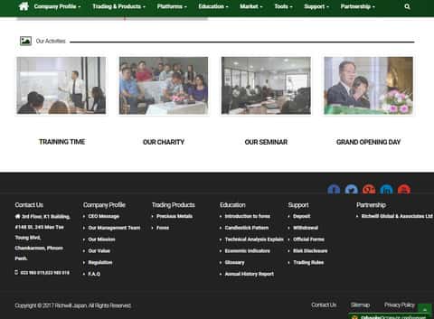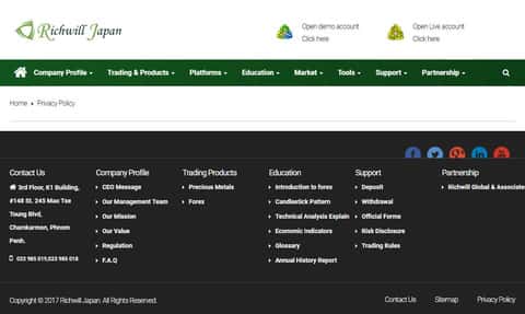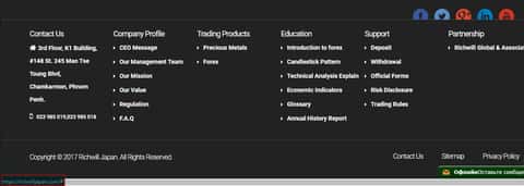 Завершается подвальный сайт мошенников Richwill Japan довольно стандартным меню со ссылками на различные разделы сайта, а так же ссылками на страницы аферистов Ричвилл Джапан в различных социальных сетях. На изображении, расположенном ниже, вы можете увидеть довольно стандартное окончание подвального сайта лохотрона Richwill Japan.