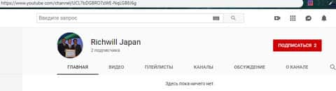 Для размещения различных видеороликов и остальной рекламной информации аферисты Richwill Japan обзавелись страницей в социальной сети YouTube. Данная страница у шулеров Ричвилл Джапан никакой активностью не отличается и создана исключительно для виду. На изображении, расположенном ниже, вы можете увидеть страницу шулеров Richwill Japan в Ютубе.
