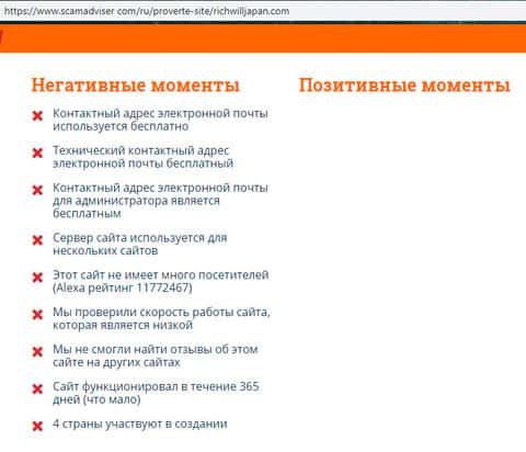 В связи с мошеннической и противозаконной деятельностью лохотрона Richwill Japan в течении более двух лет его руководители предпочитают анонимность дабы избежать ответственности со стороны правоохранительных органов. Информацию о самом сайте лохотрона Ричвилл Джапан можно узнать с помощью портала scamadviser com, которую вы можете прочесть ниже.