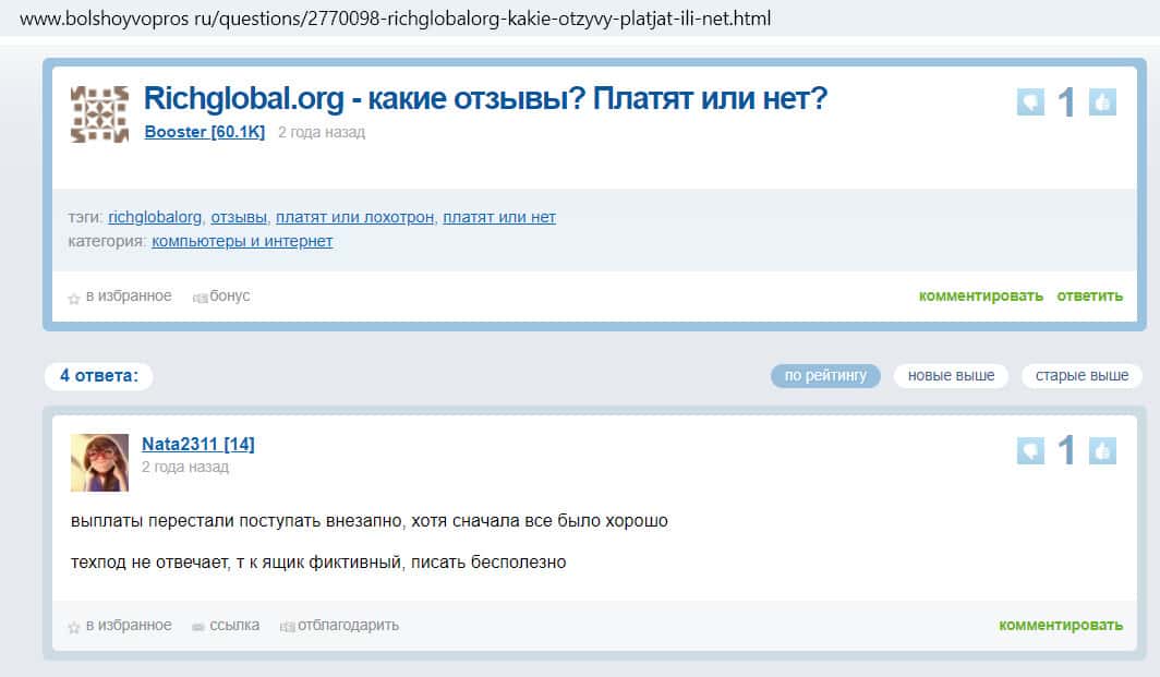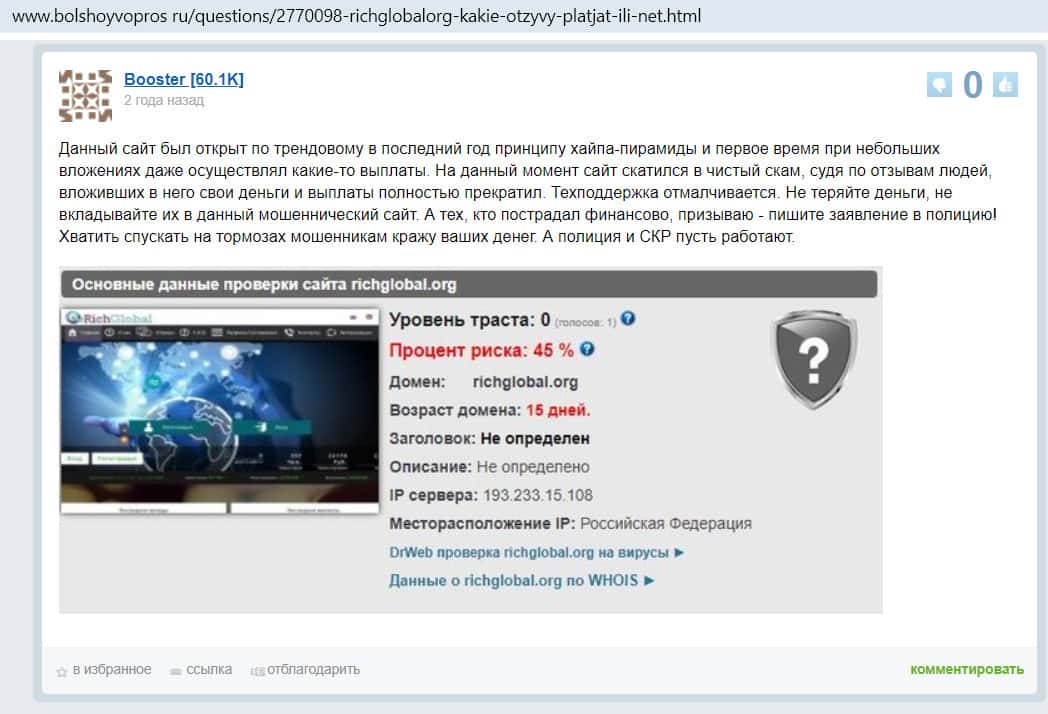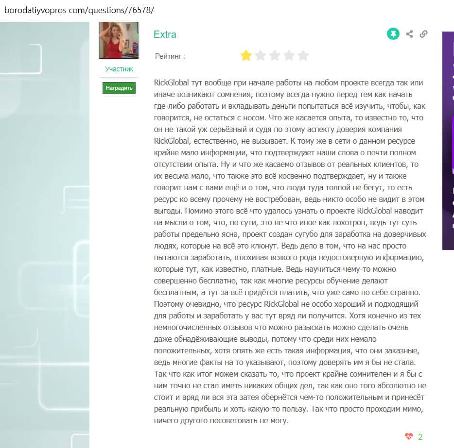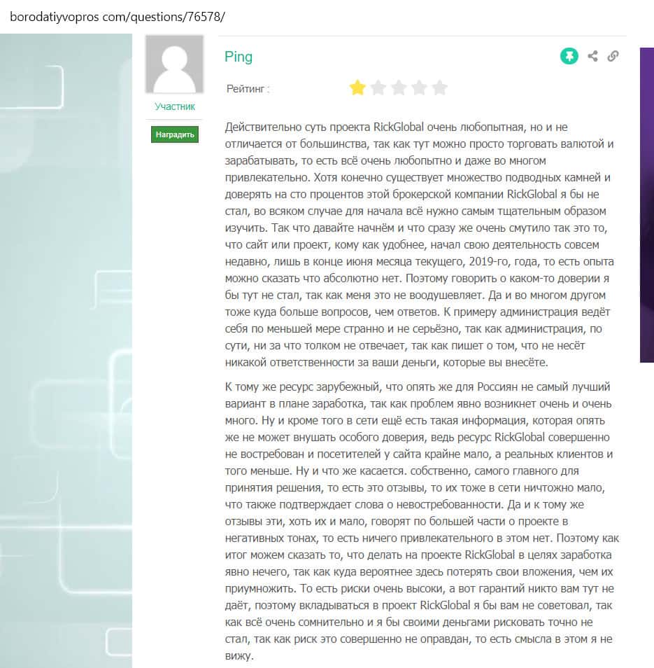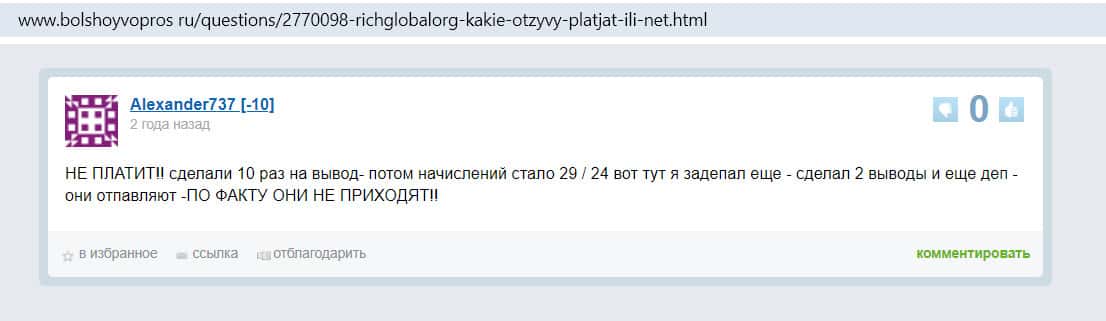 - Негативный комментарий на форуме bolshoyvopros ru к вопросу пользователя о том, платят ли на площадке Рик Глобал