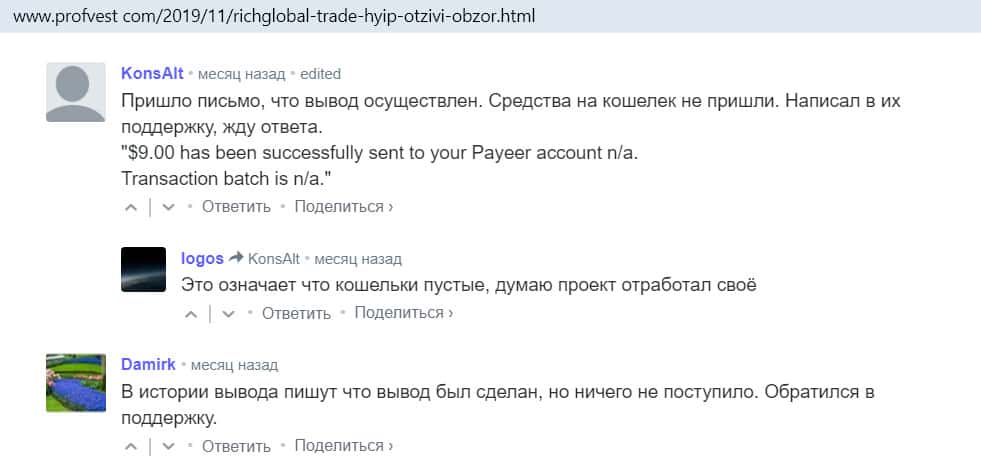 - Переписка клиентов Рик Глобал на сайте Профвест показывает, что скам-проект набрал обороты