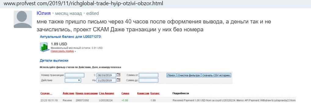- Комментарий на сайте profvest com о том, что жулье с RickGlobal нагло обманывает своих клиентов