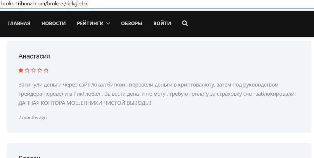 Пользователь Анастасия, обманутая аферистами из Рик Глобал, оставила отрицательный отзыв на сайте Брокертрибунал. Девушка перевела на эту площадку криптовалюту, купленную ей у другого брокера. После этого мошенники заблокировали ее аккаунт, требуя оплатить страховку. Анастасия не имеет доступа к своим деньгам, и, скорее сего, уже никогда их не увидит.