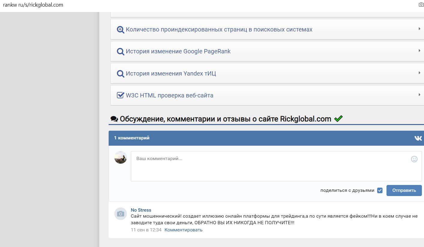 Ресурс rankw ru занимается анализом сайтов, давая им оценку на основании полученной информации. Данные о сайте Рик Глобал таковы: зарегистрирован в 2015 году, владелец домена неизвестен. Под этой информацией оставлен отзыв, говорящий о том, что указанный брокер является фейковым. Рик Глобал лишь создает иллюзию торговли, забирая деньги у пользователей.