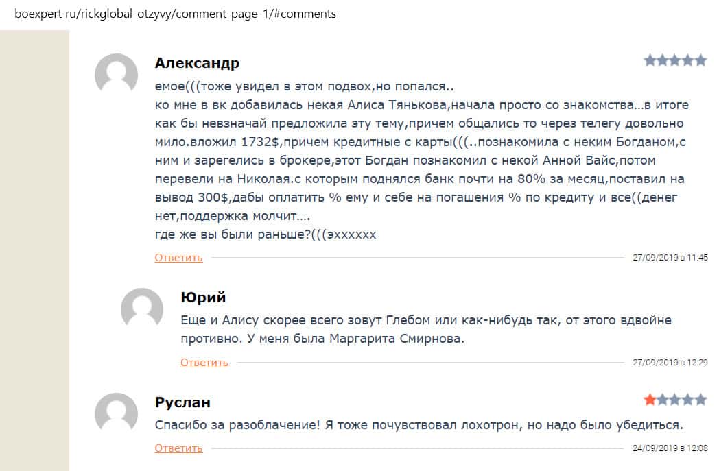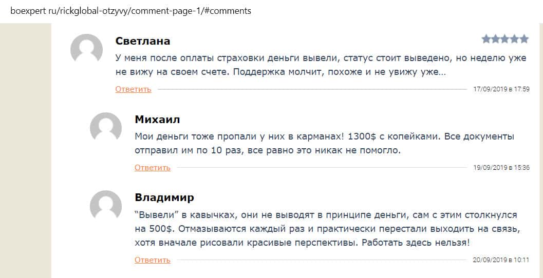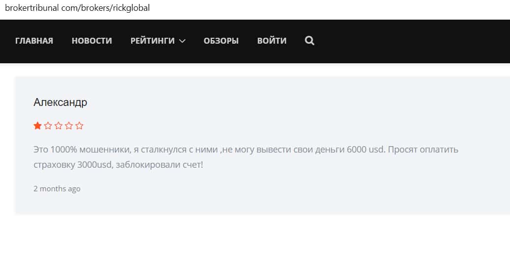 Александр описал свою ситуацию на сайте Брокертрибунал, оставив негативный отзыв о компании Рик Глобал. Его, как и других, заманили лживыми обещаниями, уговорив зарегистрироваться и внести валюту на счет. После того, как он вложил 6000 долларов, аккаунт заморозили. Менеджеры заставляют оплатить страховку в размере 3000 долларов, чтобы вывести средства.