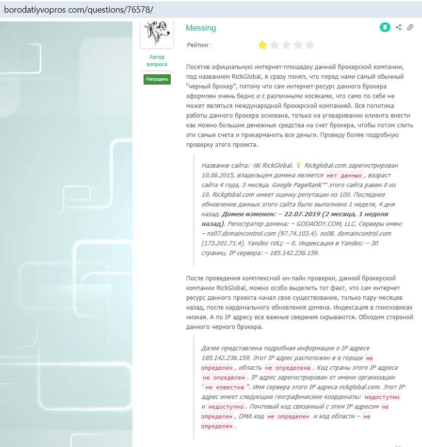 Отзыв на сайте borodatiyvopros com: Рик Глобал - черный брокер, которого нужно обходить стороной