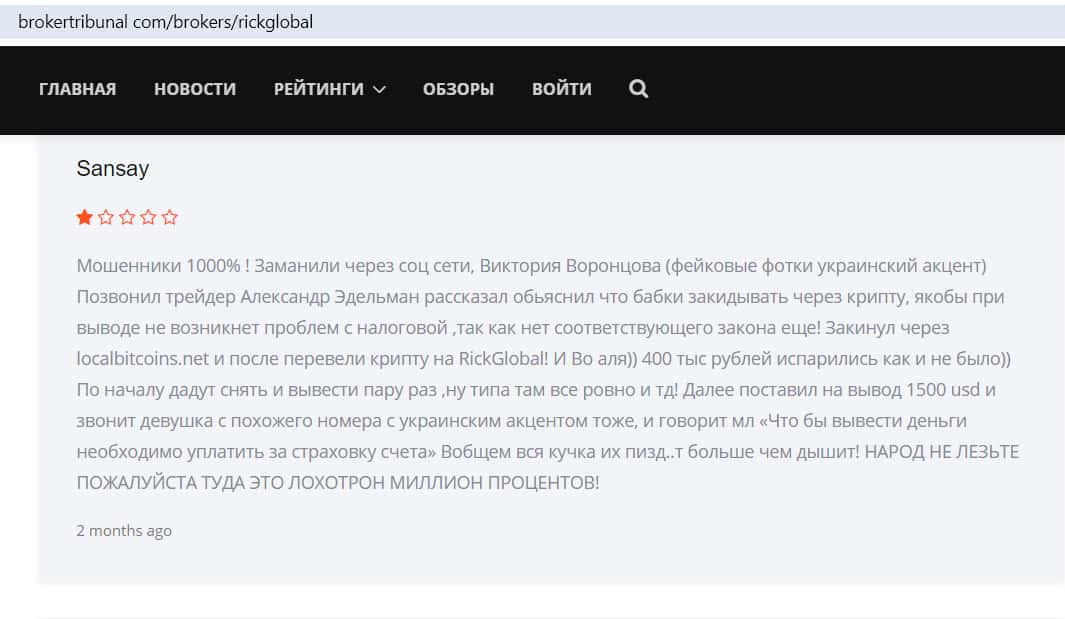 Пользователь с ником Sansay поделился своей историей на сайте Брокертрибунал. Ему позвонила девушка и уговорила положить деньги на счет в Рик Глобал. Менеждер посоветовал перевести средства в криптовалюту, чтобы не было проблем с налоговой. Мужчина вложил 400 000 рублей и все потерял. Под предлогом неуплаты за страховку счет был заблокирован.