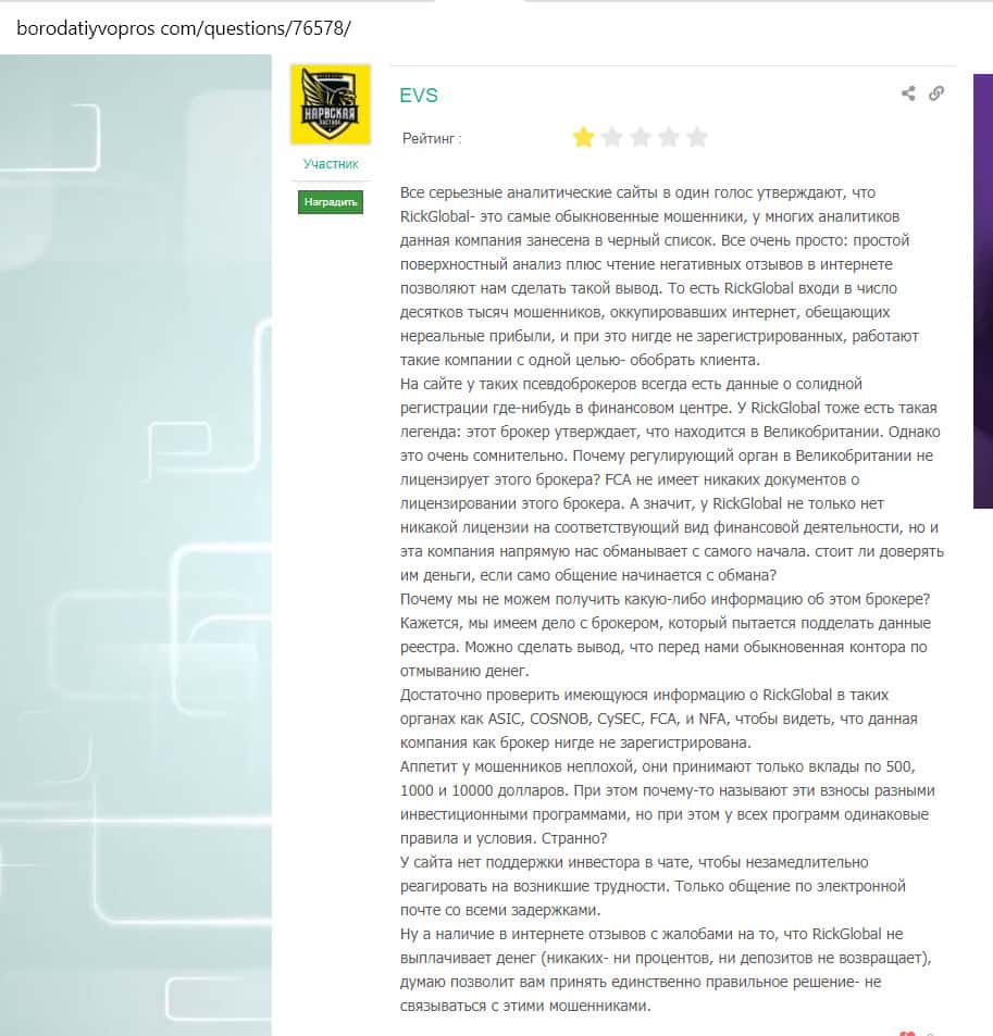 Из отзыва на сайте Бородатыйвопрос следует, что все аналитики единогласно заносят Рик Глобал в черный список. Ее организаторы врут напропалую, утверждая, что они зарегистрированы в Англии и имеют все необходимые документы. Однако в регуляторах никогда не слышали об этой шарашке. Также подозрение вызывают высокие минимальные вклады и отсутствие нормальной поддержки.
