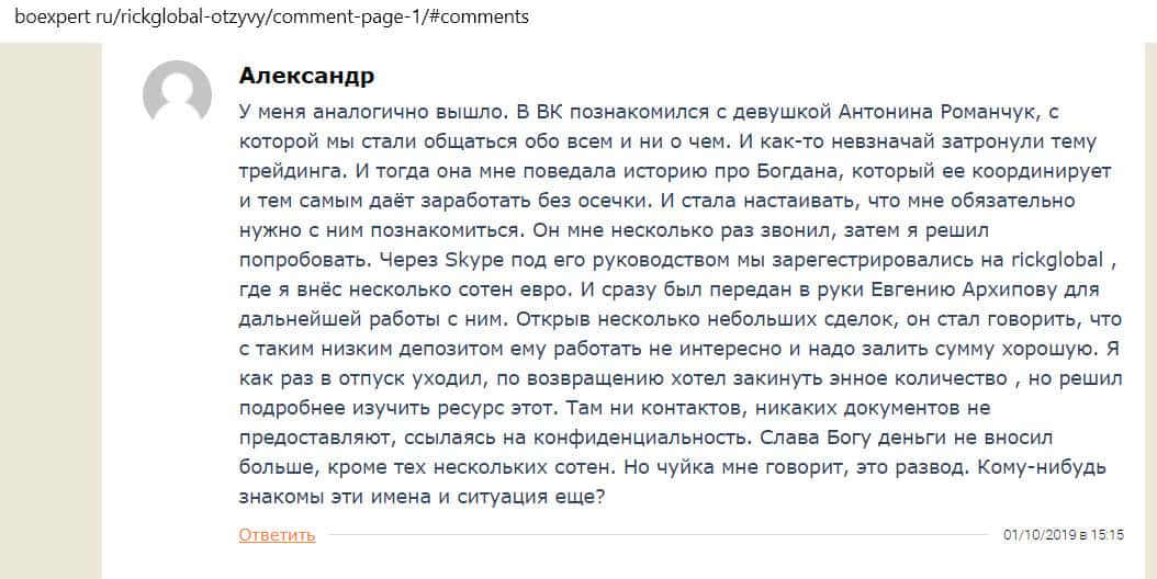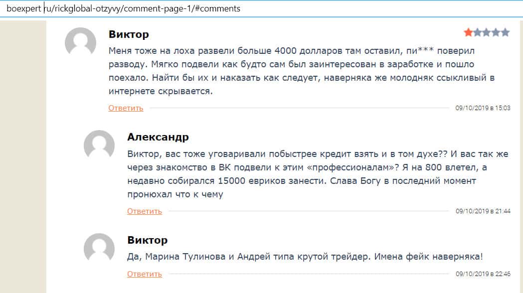 Виктор пишет на сайте boexpert ru о том, как он попался на уловки жуликов из Рик Глобал. Сначала с ним познакомилась девушка по имени Марина, заставила зарегистрироваться на псевдобирже, а затем передала его контакты менеджеру Андрею. В результате мошенники Виктора забрали 4000 долларов.
