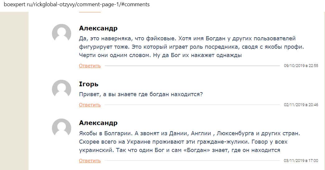 Множество граждан, пострадавших от действий бандитов из Рик Глобал, говорят, что им звонят по телефону и начинают разводить, представляясь менеджерами из брокерской компании. При этом мошенники называют разные имена, которые, скорее всего, фейковые, и каждый раз называют разные страны Европы. Однако все они разговаривают с украинским акцентом, видимо, создана их банда в Украине.