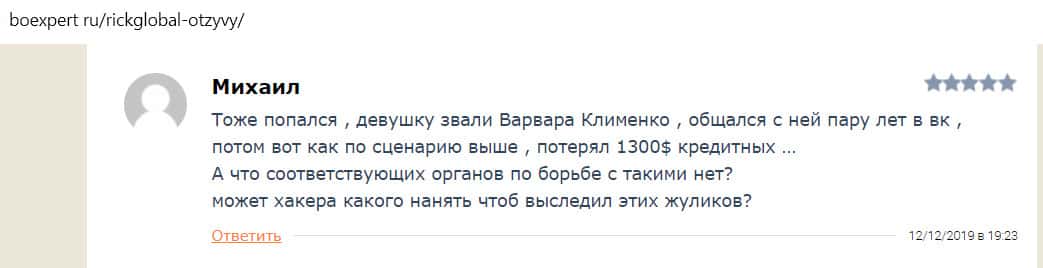 Михаил написал на сайт boexpert ru о том, как нагло его развели мошенники из Рик Глобал. Целых два года он общался с девушкой в соцсетях, которая все-таки смогла уговорить мужчину вложить деньги в этот жульнический проект. В результате Михаил потерял 1300 долларов. Такое долгое общение в соцсетях доказывает, что здесь работают профессиональные мошенники.