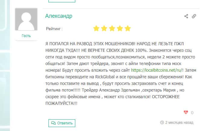Александр предостерегает всех в своем отзыве на сайте Бородатыйвопрос от разводил, называющих себя бирже Рик Глобал. Они знакомятся со своими жертвами в соцсетях, представляясь поддельными именами. Затем уговаривают внести на счет биткоины и застраховать свой вклад. Как только вы это сделали - можете попрощаться со своим депозитом!