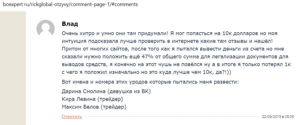 Влад оставил свой комментарий на сайте boexpert ru о том, что вложил 1000 долларов в торговлю на площадке RickGlobal. Лжеброкер требовал от него вложить еще как минимум 47%, но мужчина прочитал отзывы об этой шараге и все понял. Изначально он хотел вложить 10 000 долларов, чтобы заработать большую сумму. В итоге он рад, что потерял всего 1000, а не в 10 раз больше, как планировал.