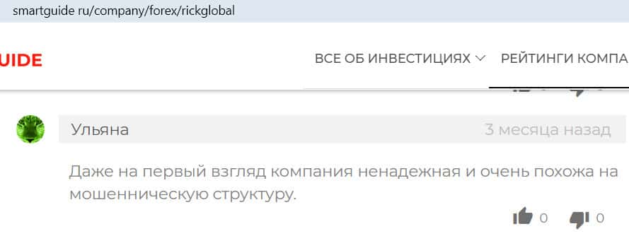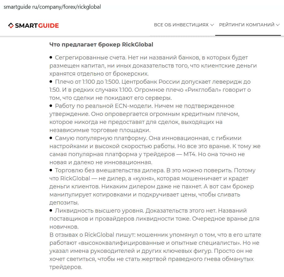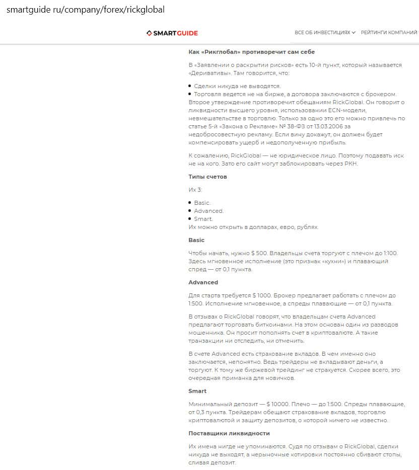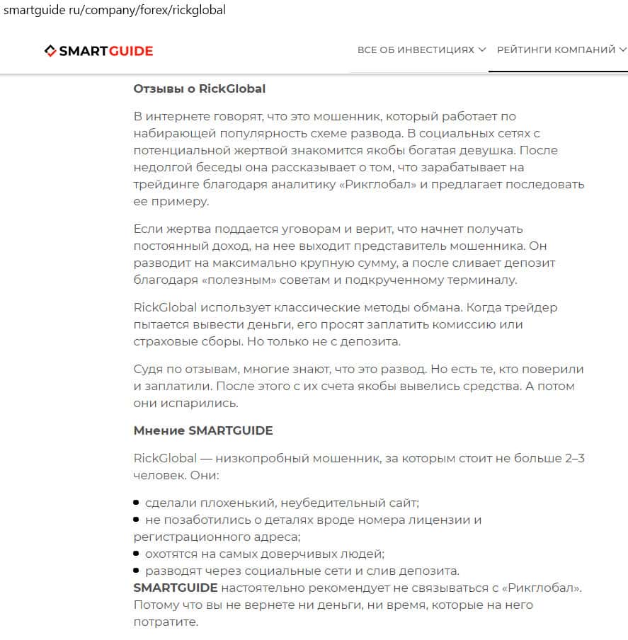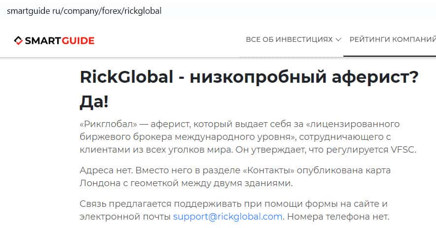 - Сайт smartguide ru назвал компанию Рик Глобал низкопробным аферистом, выдающим себя за лицензированного брокера