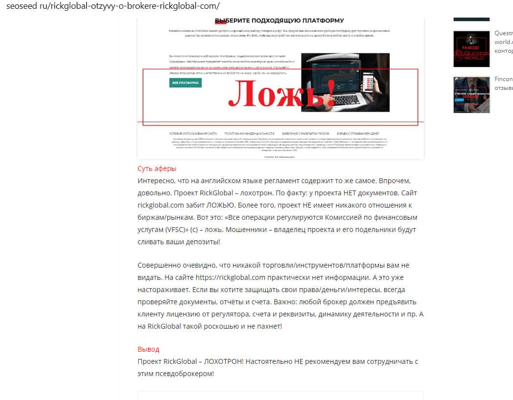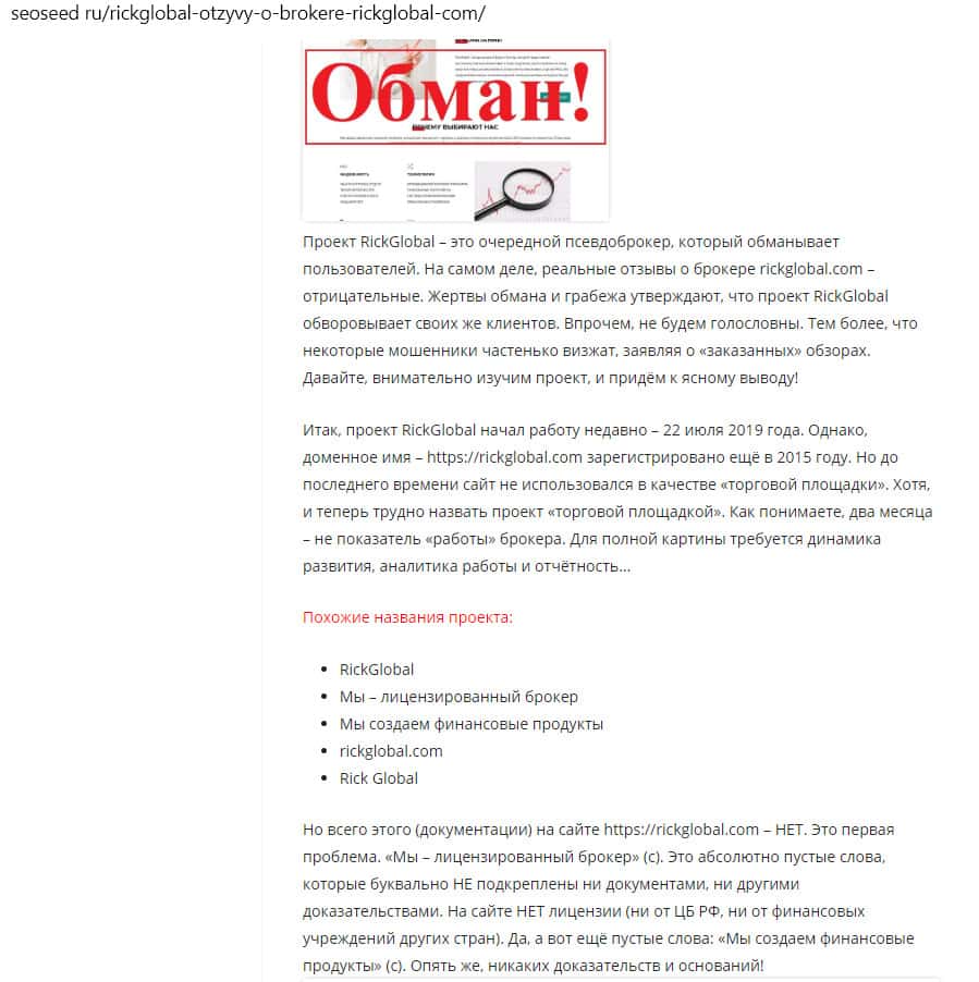 Вердикт сайта seoseed ru о конторе Рик Глобал: сайт забит ложью, а его владельцы будут сливать депозиты всех своих клиентов!