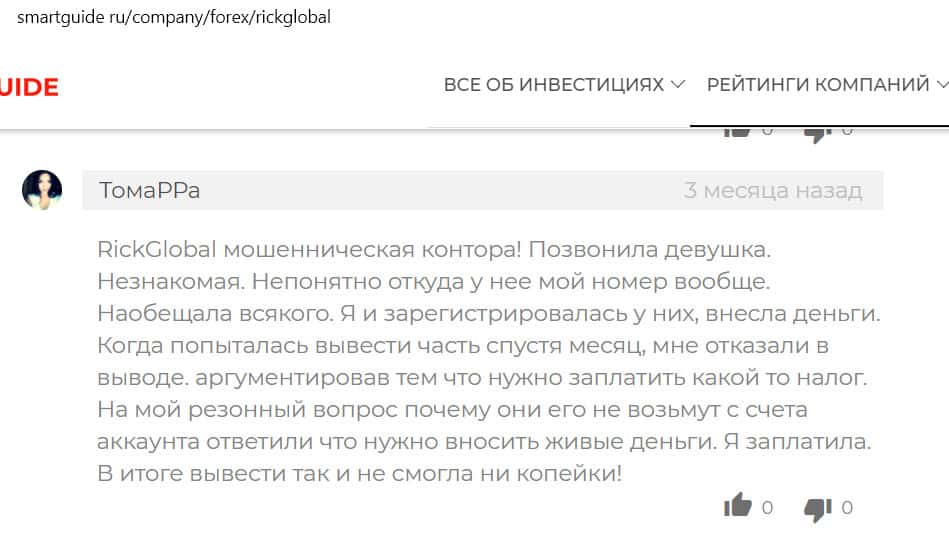 Тамара описала на сайте СмартГьюд свою историю печального сотрудничества с Рик Глобал. Ей позвонила незнакомая девушка и уговорила зарегистрироваться на мошенническом сайте. Тамара пополнила депозит и через месяц хотела вывести прибыль, но ей отказали под предлогом неуплаты налога. Женщина заплатила и налог, но денег все равно не получила.