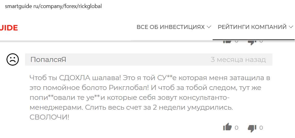 Мошенники из бандитской организации RickGlobal забирают у людей не только деньги, но и последние нервы. На сайте Смартгьюд появился комментарий такого негативного содержания, что модераторам пришлось замазывать слова, неподходящие для чтения. Аферисты довели человека до белого каления, слив его счет за две недели.